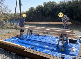 せっかくなので、ウッドデッキの上で、柱と梁の3本を組んで