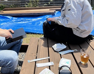 棟上げ前にコーヒー休憩です。嫁さんと3人で和やかな休憩に