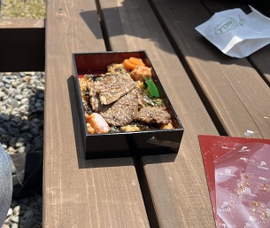 途中の道の駅でステーキ弁当買ってきたので、みんなで頂きま