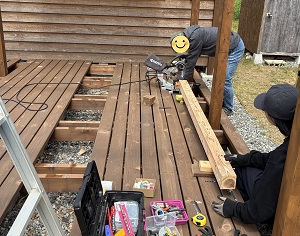 息子の方は黙々とデッキ板をカットしては貼っていきます。