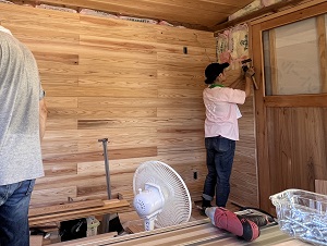娘が帰ってきているので、入り口横の羽目板お任せしました。