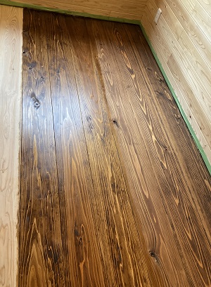 だいたい設置の完了した床ですが、小屋の内装が全部、杉の無垢材で