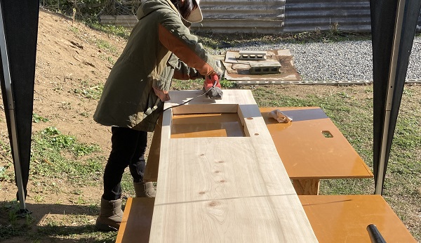 快適になったスライド丸鋸を使って、設計した通りの寸法で、45mm角材を