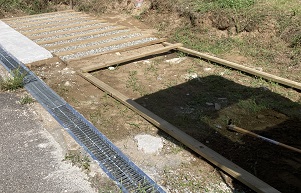 裏の庭の方、能登の大雨で、土が流されています。横にも土留め