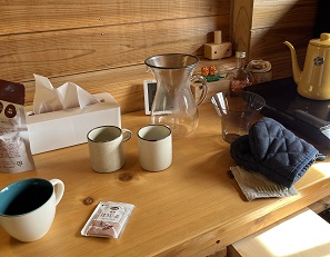 デッキがオガクズだらけなので小屋の中でコーヒー休憩です。